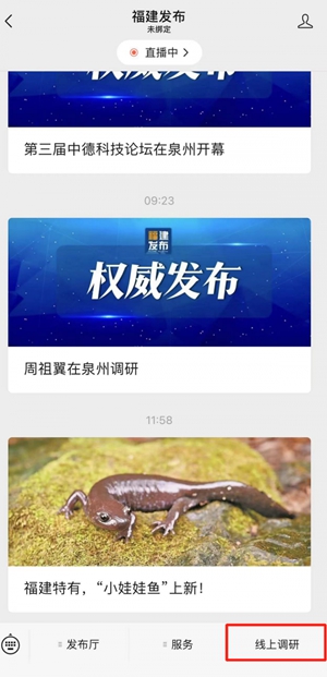 通过“福建发布”微信公众号、新福建客户端等省、市、县三级媒体相关新媒体渠道,以及所属网站(点击“飘窗”进入调研链接),参与线上调研